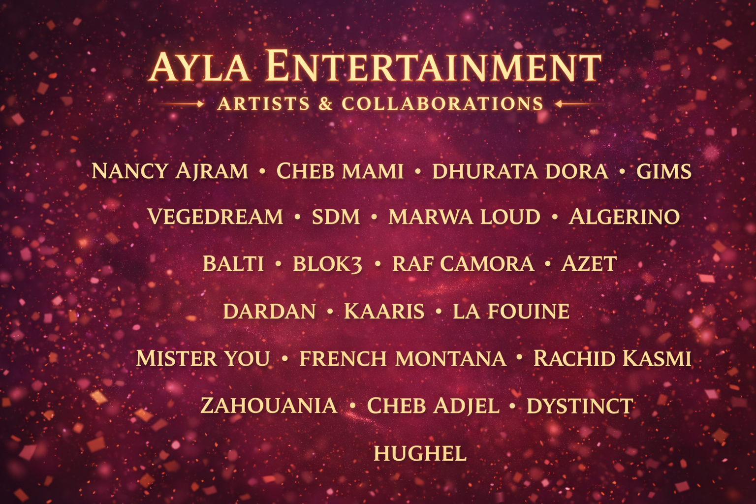 Ayla Entertainment creates unforgettable experiences — from concert tours to World Cup events. We work with artists, venues, and partners like the Moroccan & Turkish Embassies to bring people together through music, culture, and entertainment.